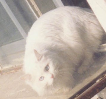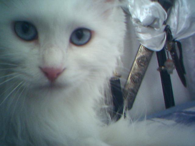 Amy: 女,1岁2月,白。蓝灰大眼,偶泛艳红,瞳孔直径变化范围1至10mm。除了睡觉,吃喝拉撒有固定地点。
